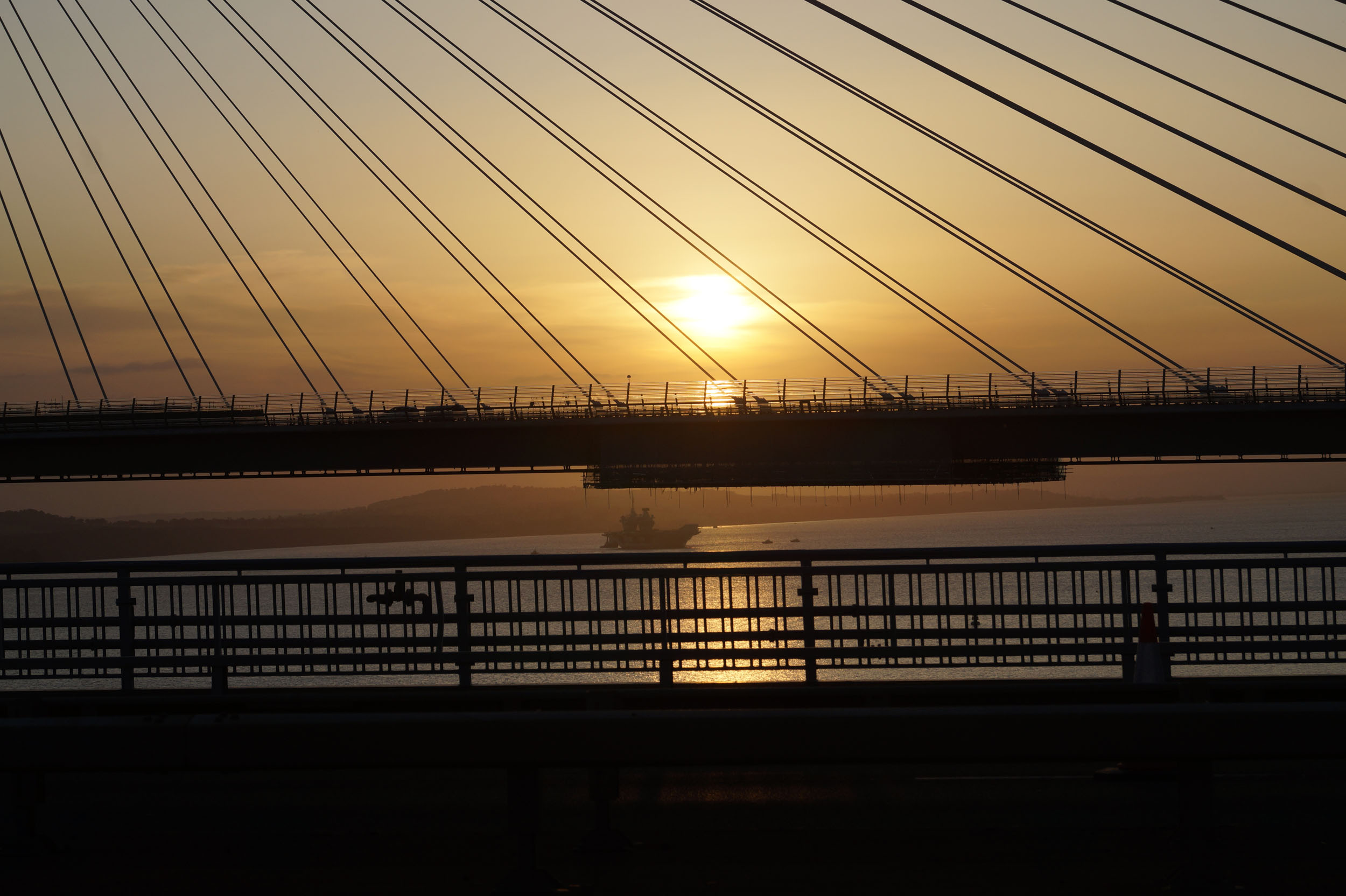 Sunset over the road bridges and HMS Prince of Wales